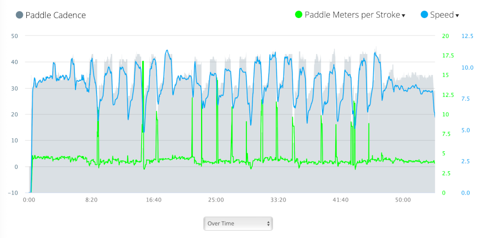 The graph below shows paddle cadence (grey) plotted against boat speed (blue) and meters per stoke (green):