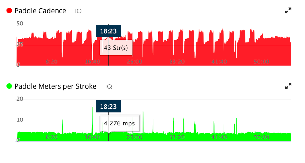 The graph below paddle cadence and meters per stroke graphs, for an activity, as shown on Garmin Connect site: